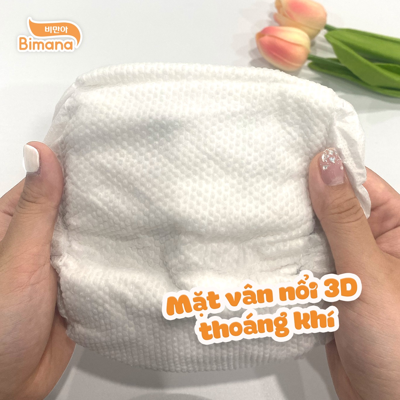 Bề mặt bỉm Bimana Extra Care được thiết kế đặc biệt với hình bầu dục, không chỉ ngăn chất lỏng tiếp xúc lâu với da mà còn giúp tăng khả năng thấm hút, cho bé luôn khô thoáng cả ngày. Điều này đặc biệt quan trọng đối với những bé có làn da nhạy cảm, giúp ngăn ngừa hiện tượng hăm bỉm hay các vần đề khác về da. Với cấu trúc vân nổi 3D, Bimana Extra Care mang đến sự thư thái cho bé yêu trong từng vận động, mà không gây nên cảm giác khó chịu. Thêm vào đó, ba mẹ cũng không phải lo lắng việc phải thay bỉm quá thường xuyên, vì tốc độ thấm hút chỉ từ 3s rất nhanh chóng và hiệu quả.